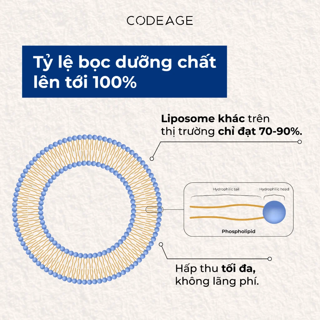 Với công nghệ Liposome tiên tiến, Codeage tự hào mang đến hiệu suất bao bọc hoạt chất tuyệt đối, đạt 100% – vượt trội so với mức 70–90% của nhiều sản phẩm khác. Điều này giúp tối ưu hấp thu và đảm bảo mỗi viên uống phát huy tối đa công dụng công dụng.